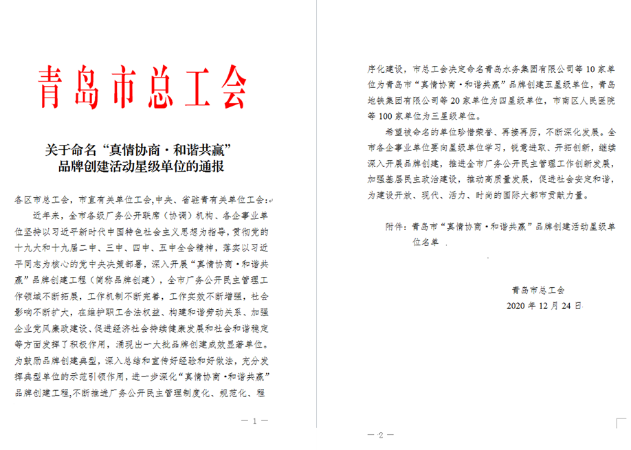 公司在青島市總工會(huì)“真情協(xié)商·和諧共贏”品牌創(chuàng)建活動(dòng)中被評(píng)定為規(guī)范化建設(shè)三星級(jí)單位